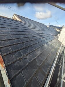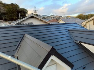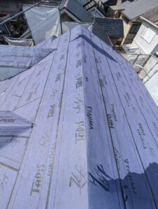 弊社馴染みのスーパーガルテクトによるカバー工法、今回は防水下地材に粘着性ルーフィング、タディスセルフを使用しました。 タディスセルフとはルーフィングの屋根下地に接する面が粘着層になっており、そのまま接着して固定する方法です。