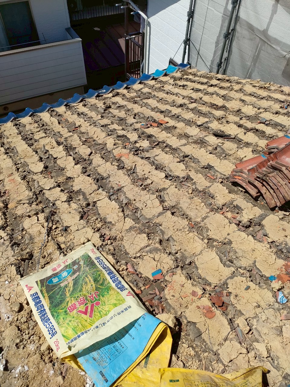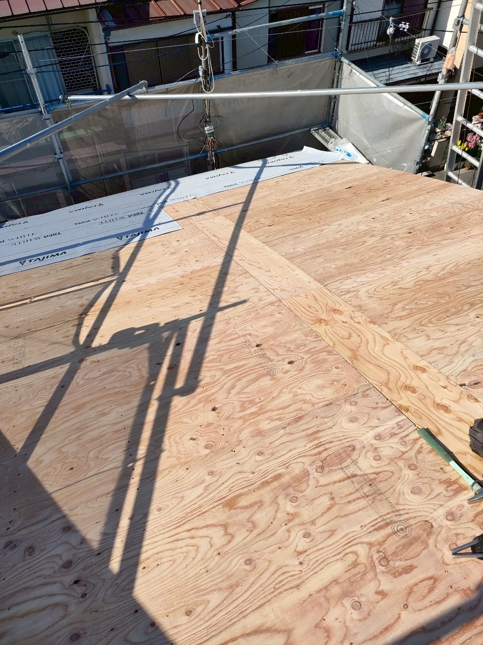 既存の瓦をめくり、下地処理してからルーフィングを貼り、スーパーガルテクトを施工しました。
