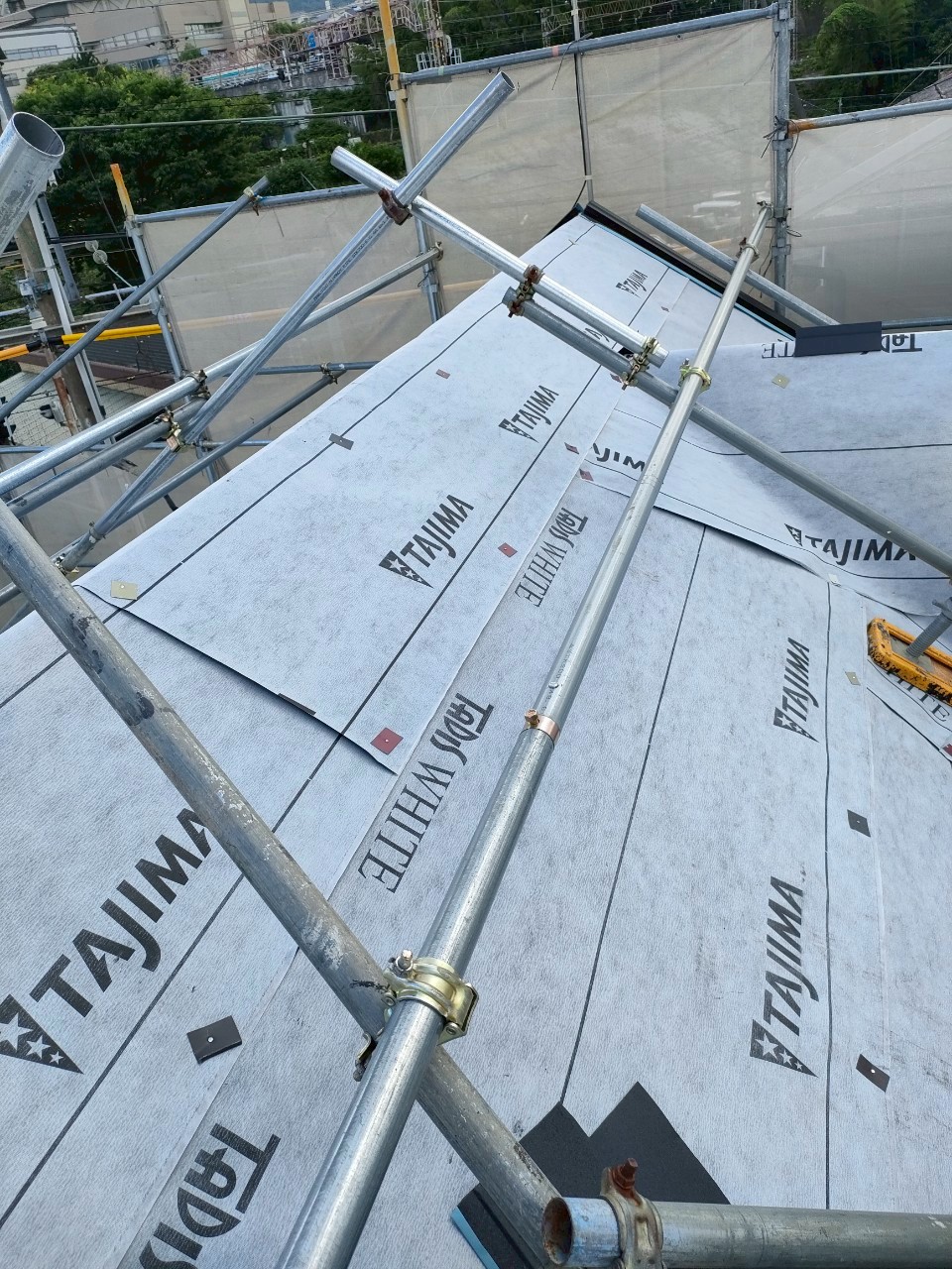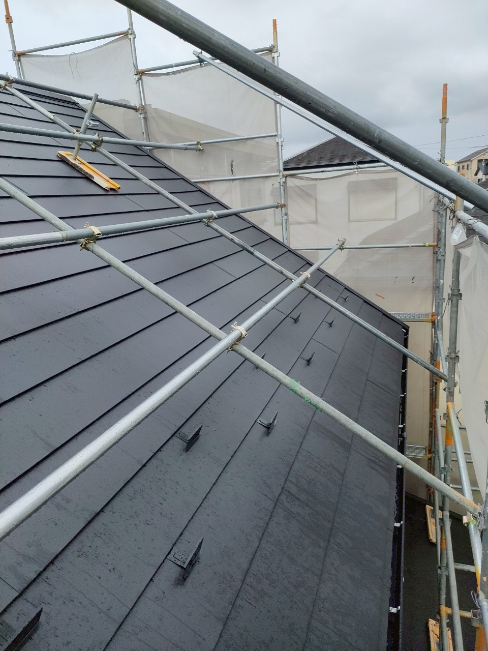 急勾配のため、屋根足場を設置しております。