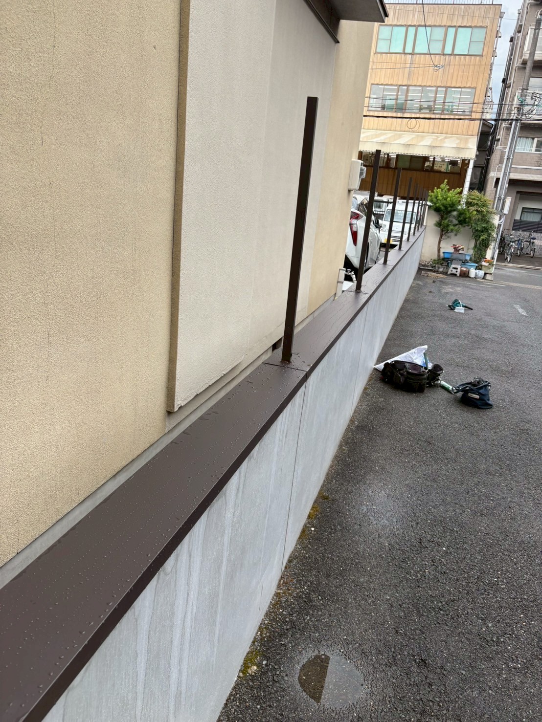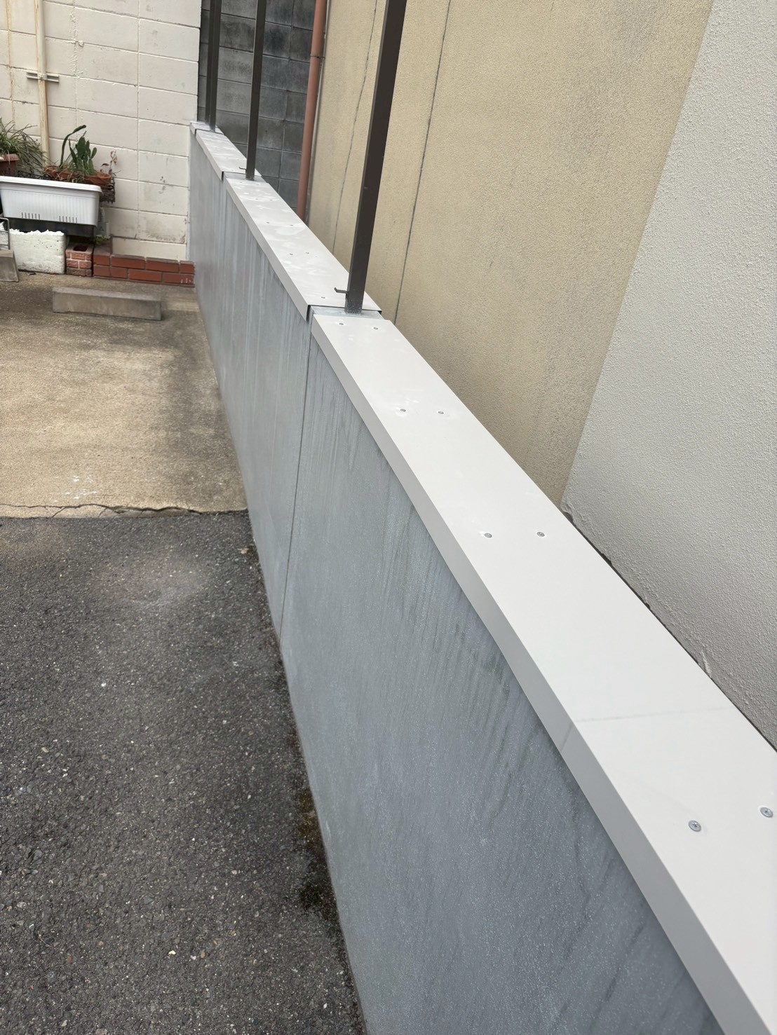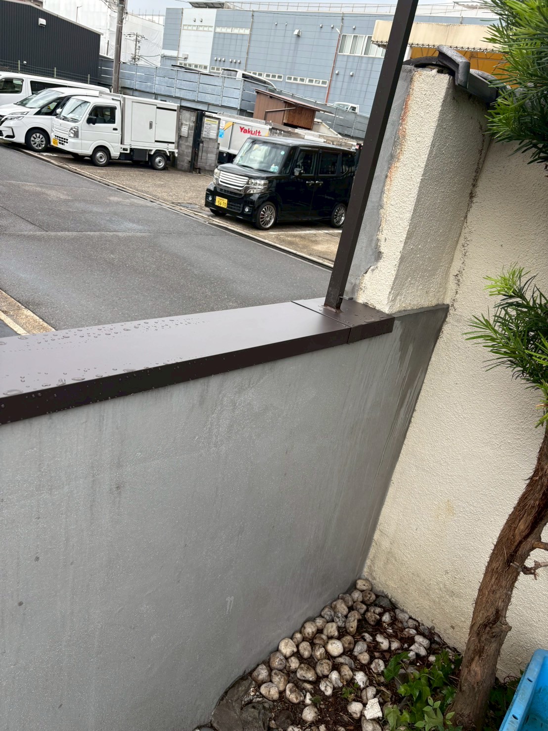 今回の施工事例は笠木板金の取付を掲載します。弊社では捨て笠木を先に取りつけ、捨て笠木のうえに本笠木をはめ込みます。本笠木はビスを使わず取付ますので見た目もよく、止水性にも優れた取付方法になります。本笠木取付後、ジョイント部には帯を巻き、加工部にはシーリング施工し仕上げとなります。