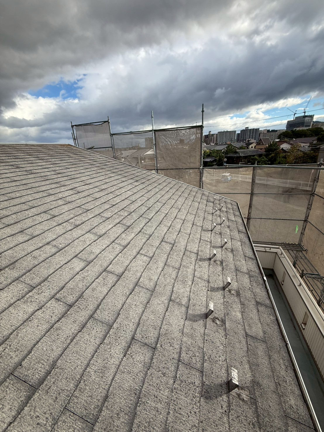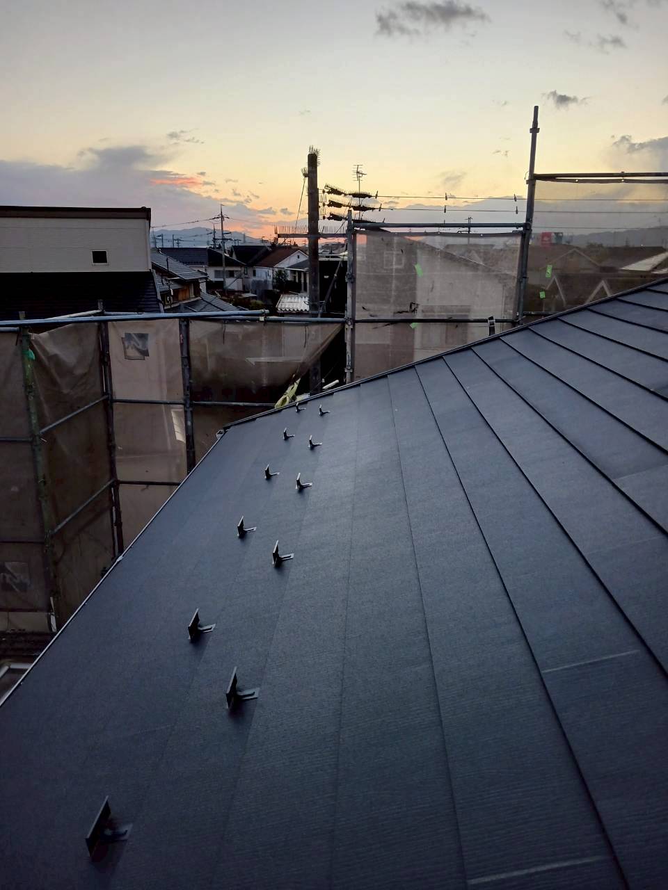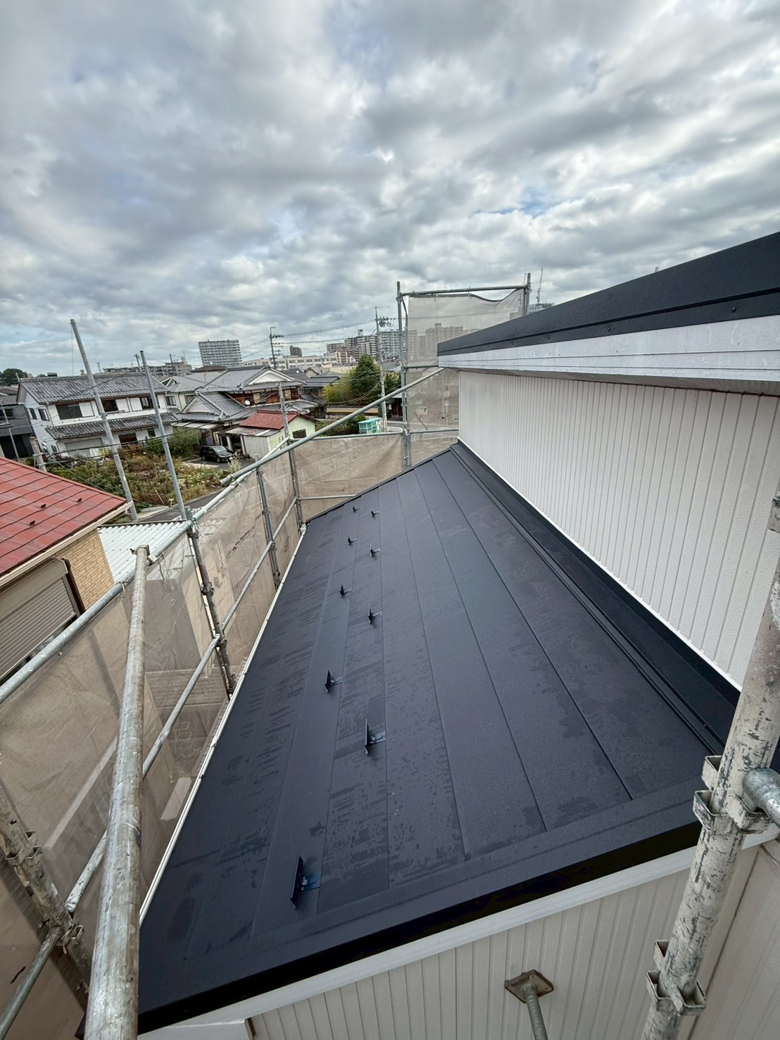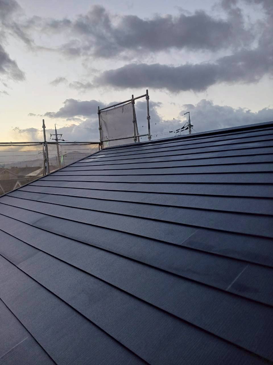 IG工業スーパーガルテクトをカバー工法をさせていただきました。今回の物件の屋根は片流れ、下屋2カ所になり、色はシェイドブルーです。シェイドブルーはあまり出ない色ですが、洋風テイストな仕上がりでオシャレな色です。