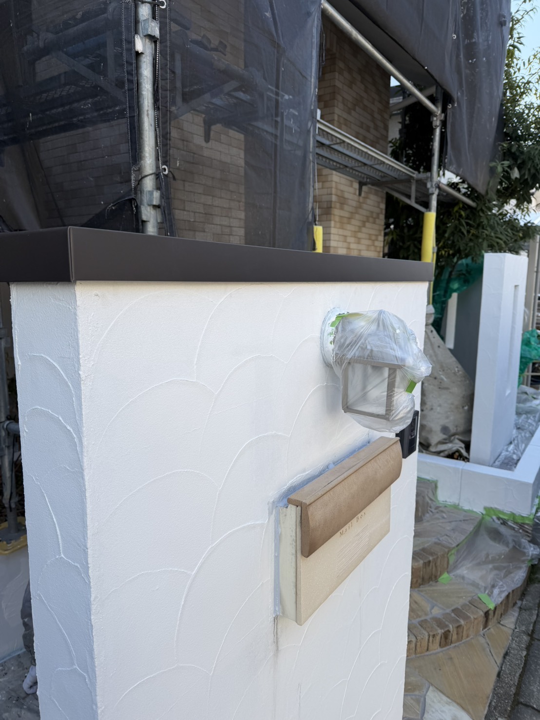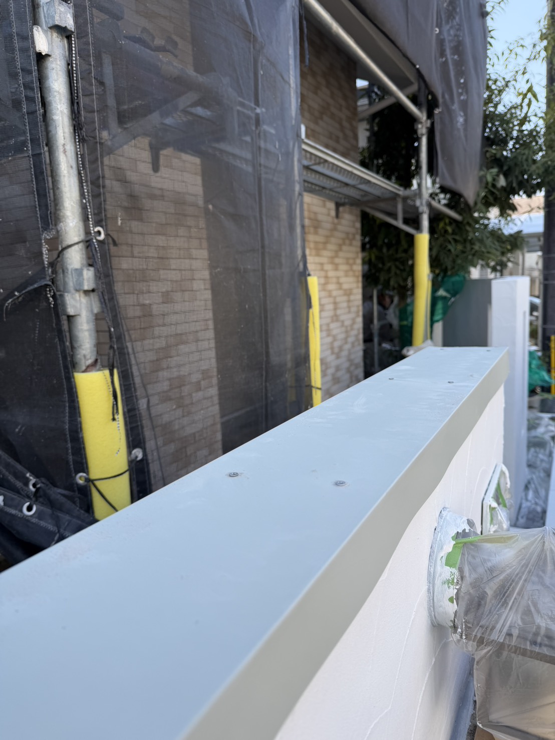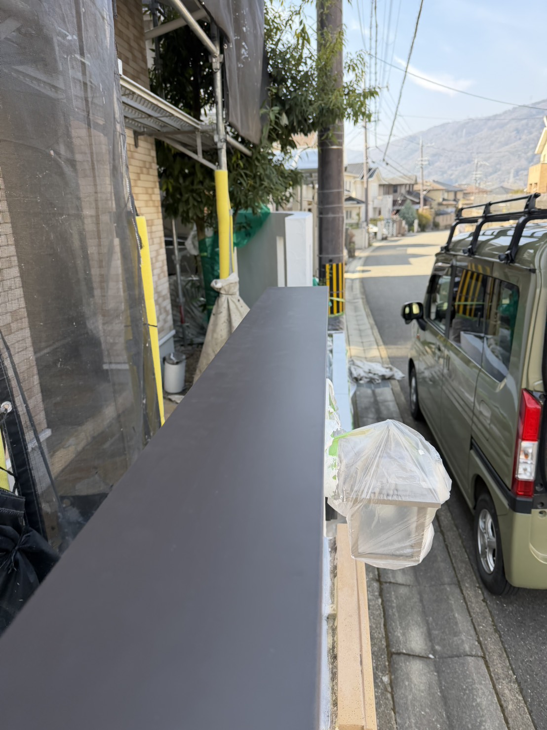 玄関の目隠し壁の天端にガルバリウム鋼板の笠木板金を取付ました。意匠性、防水性ともに良いためここ最近依頼が多くなっております。