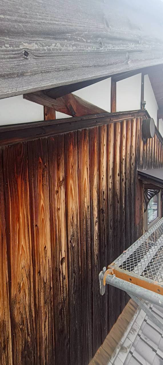 既存の杉板をめくり、防水紙を張ってから下地処理をした後、金属角波サイディングを施工しました。