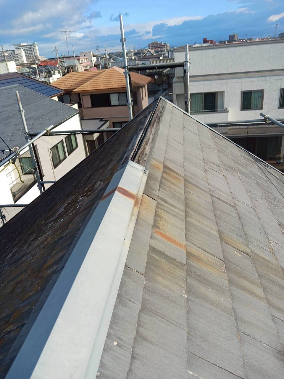 IG工業スーパーガルテクトのカバー工法を施工しました。今回の物件は一軒家の屋根を半分のみの施工となっております。またRC構造で建てられており釘が効かないためルーフィングは粘着ルーフィングを使用しました