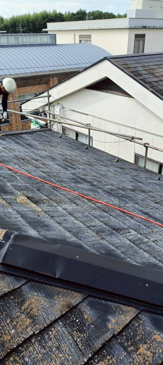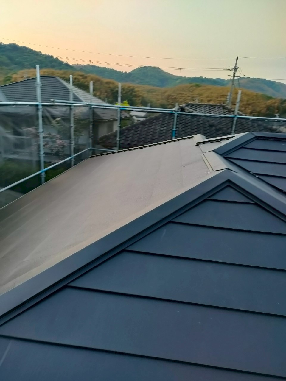 今回の案件はIG工業、スーパーガルテクトによるカバー工法を施工しました。屋根の形状は切妻ベースの谷が一箇所となります。約2日間の工事をさせていただきました。
