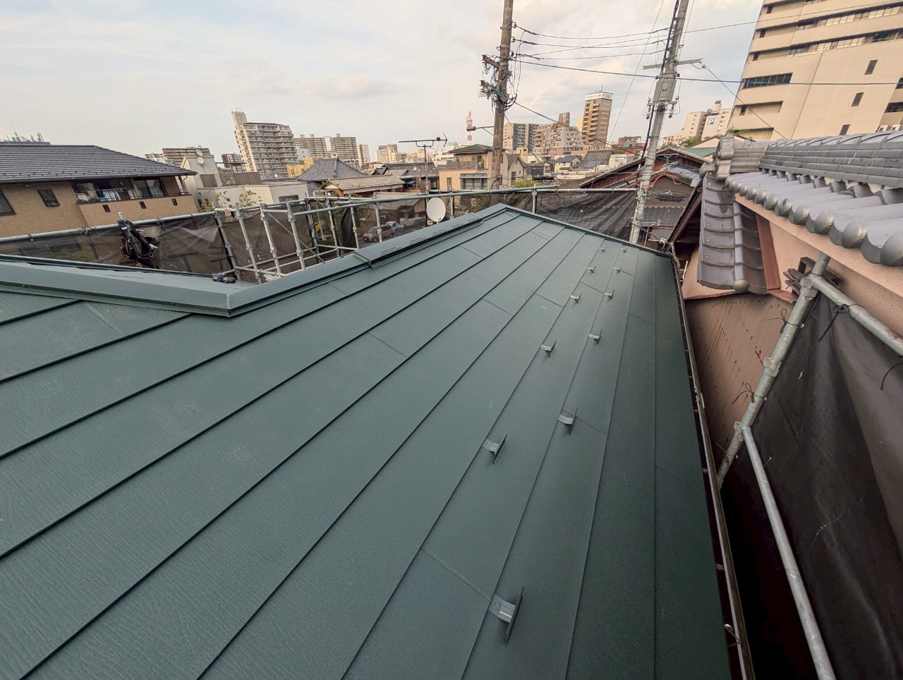 今回の案件は隣家と繋がっている家をIG工業のスーパーガルテクトにてカバー工法を施工しました。隣家と取合い部分には念には念を入れ、ルーフィングの上に粘着ルーフィングを貼り防水補強を施しております。カバー